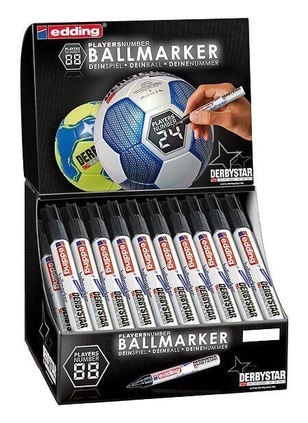 Edding 3000 im Derbystar-Design zum Beschriften von Fussbällen und weiteren Sportbällen sowie zur Zeichnung der Players Number. Wasserfest, extrem haltbar und abriebsfest.