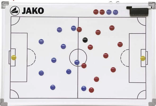 Damit auch das nächste Spiel ein voller Erfolg wird, gibt es für die Ansprachen vor dem Spiel und für taktische Schulungseinheiten beim Training das Taktikboard von Jako. Das Board bietet durch seine magnetischen Markierungspunkte allerhand Möglichkeiten Spielzüge zu erklären und analysieren. Egal ob an der Wand, auf dem Boden oder auf dem Rasen liegend. Für Beschriftungen gibt es den beiliegenden Stift.